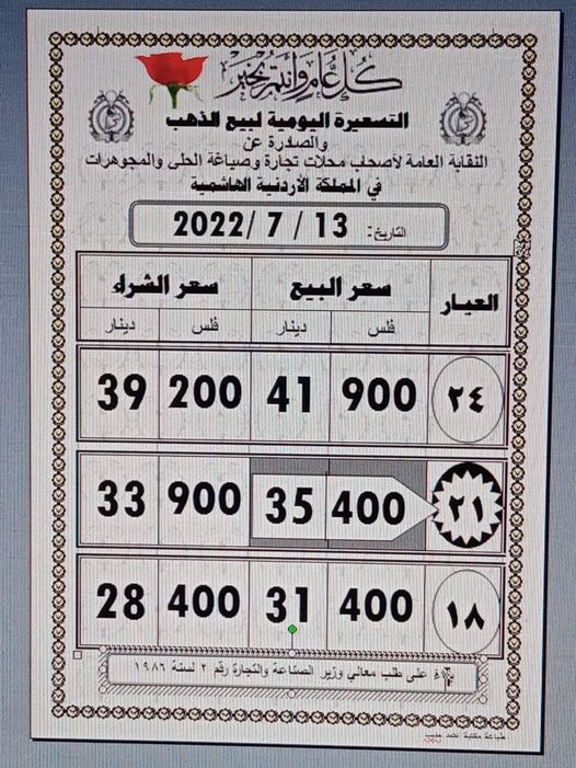 ووفق نقابة أصحاب محلات تجارة وصياغة الحلي والمجوهرات، فقد بلغ سعر بيع غرام الذهب عيار 21 الأكثر رغبة من الأردنيين بالسوق المحلية عند 35,40 دينارا لغايات شراء المواطنين من محلات الصاغة.