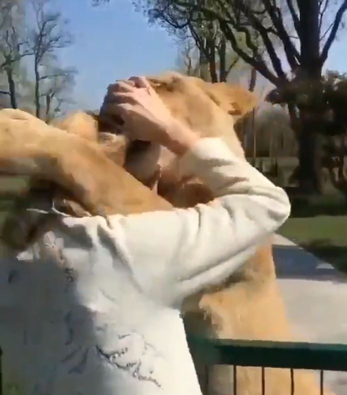نبأ الأردن- في مشهد إنساني بمعنى الكلمة احتضن أسدان سيدة كانت تعتني بهما بطريقة تعبر عن صدق المشاعر.