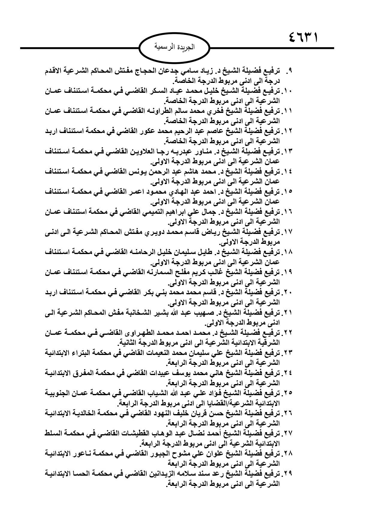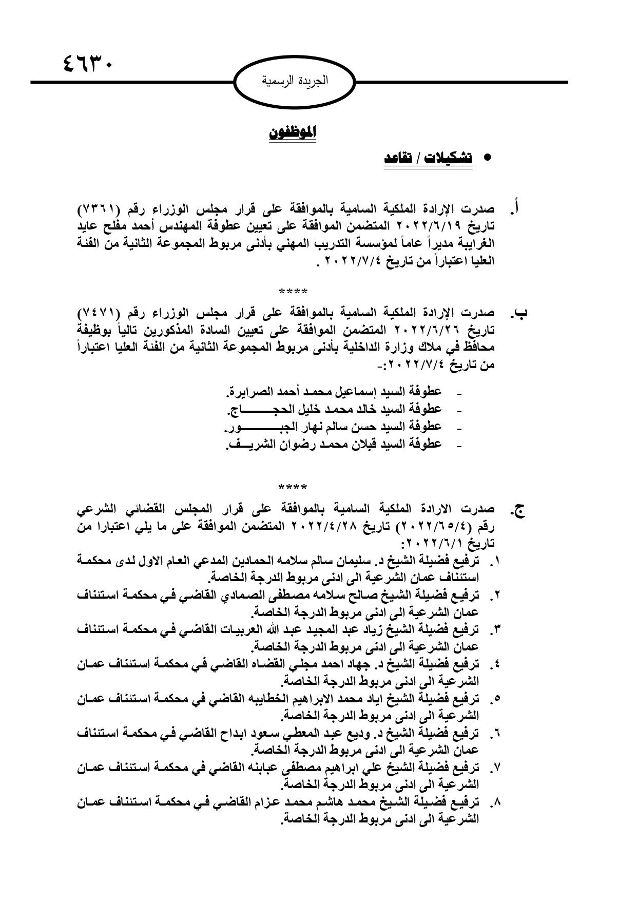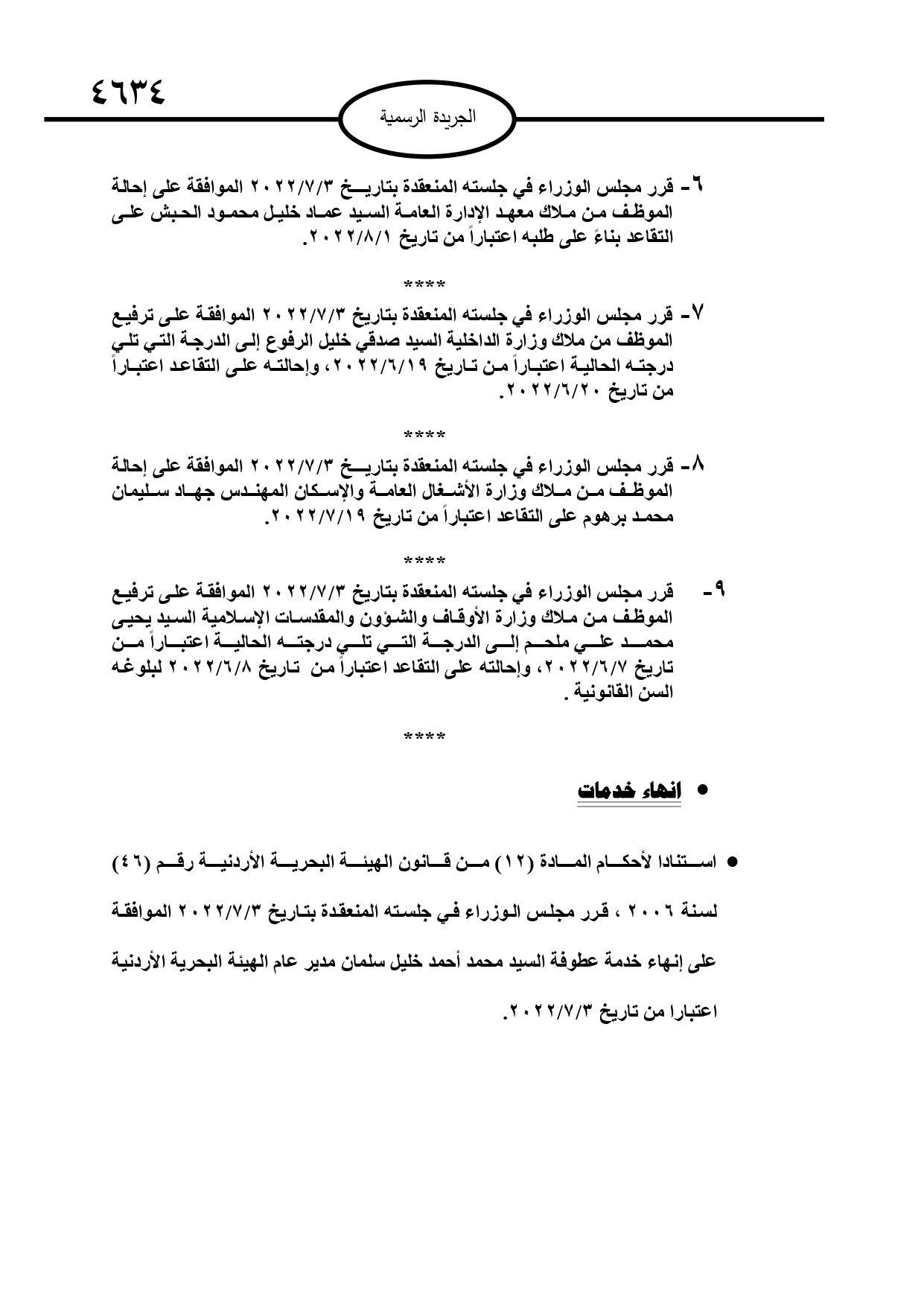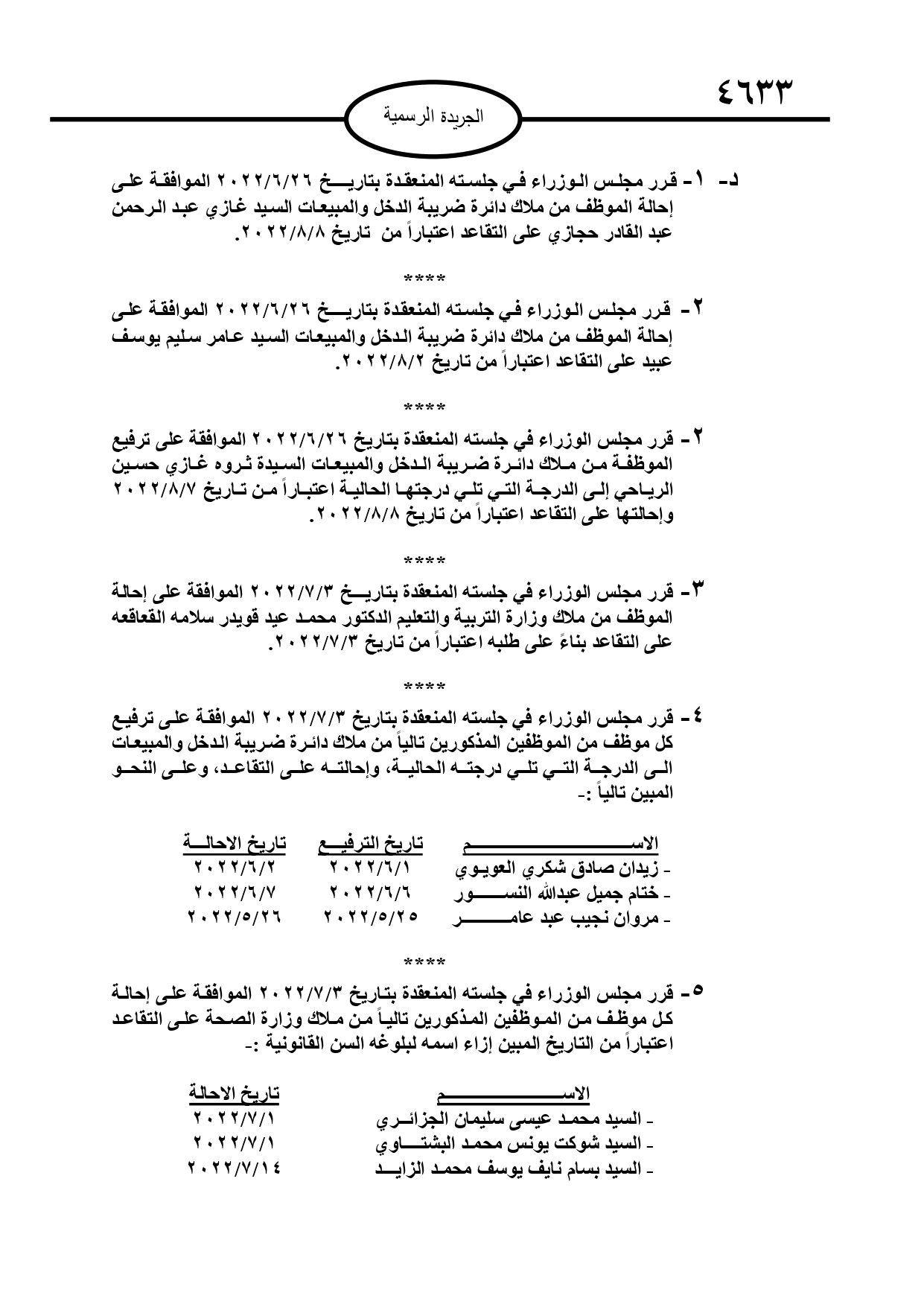 كما قرر مجلس الوزراء الموافقة على اجراء احالات الى التقاعد، لعدد من الموظفين في المؤسسات والوزارات، وإجراء ترفيعات لموظفين آخرين، وفق ما ورد بالجريدة الرسمية.