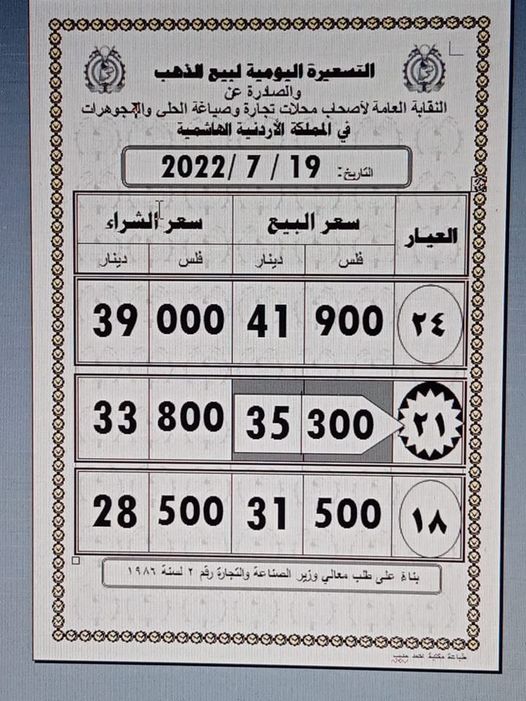 ووفق نقابة أصحاب محلات تجارة وصياغة الحلي والمجوهرات، فقد بلغ سعر بيع غرام الذهب عيار 21 الأكثر رغبة من الأردنيين بالسوق المحلية عند 35,30 دينارا لغايات شراء المواطنين من محلات الصاغة.