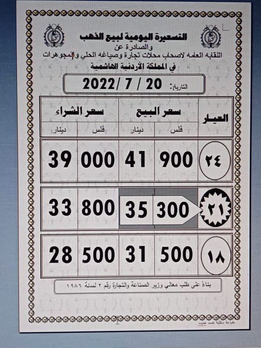 ووفق نقابة أصحاب محلات تجارة وصياغة الحلي والمجوهرات، فقد بلغ سعر بيع غرام الذهب عيار 21 الأكثر رغبة من الأردنيين بالسوق المحلية عند 35,30 دينارا لغايات شراء المواطنين من محلات الصاغة.