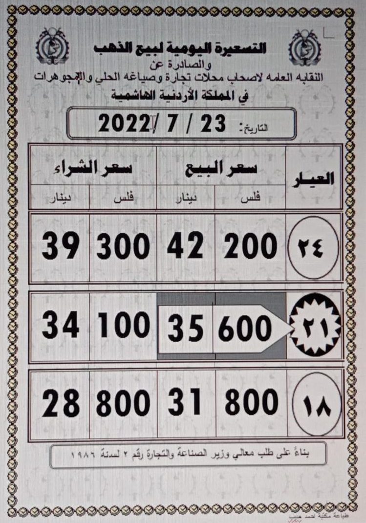 ووفق التسعيرة اليومية الصادرة عن النقابة، ارتفع سعر بيع الغرام الواحد من عيار 21 قيراط الأكثر طلبا بين المواطنين إلى 35.6 دينارا، والشراء إلى 34.1 دينارا.