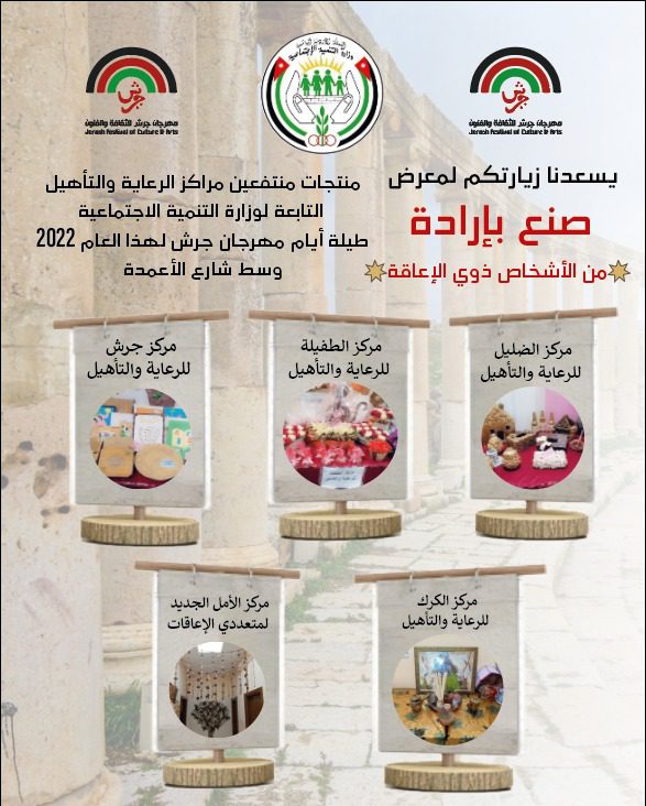 نبأ الأردن_ تشارك مراكز الرعاية والتأهيل للاشخاص ذوي الاعاقة التابعة لوزارة التنمية الاجتماعية في فعاليات مهرجان جرش للثقافة والفنون 2022 طيلة ايام المهرجان بمنتجات "صنع بارادة" من منتفعي هذه المراكز. وتعرض مراكز الرعاية والتأهيل التابعة لوزارة التنمية الاجتماعية منتوجاتها وسط شارع الاعمدة بهدف عرضها امام زوار المهرجان وابراز اعمالهم وقدراتهم التي اكتسبوها من خلال مراكز الرعاية.