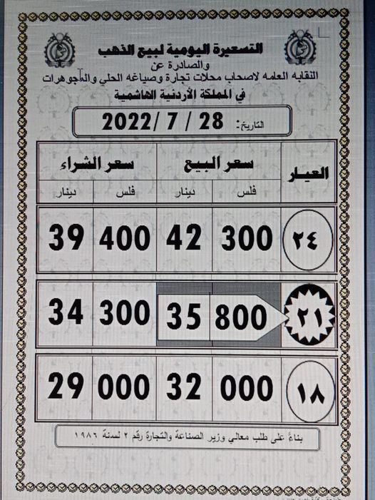 ووفق نقابة أصحاب محلات تجارة وصياغة الحلي والمجوهرات، فقد بلغ سعر بيع غرام الذهب عيار 21 الأكثر رغبة من الأردنيين بالسوق المحلية عند 35,80 دينارا لغايات شراء المواطنين من محلات الصاغة.
