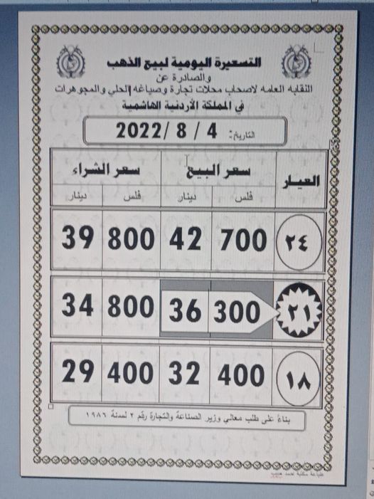 وبلغ سعر بيع غرام الذهب عيار 21 الأكثر رغبة من الأردنيين بالسوق المحلية عند 36,30 دينارا لغايات شراء المواطنين من محلات الصاغة.