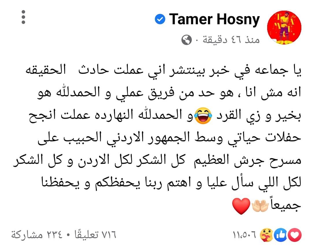 يا جماعه في خبر بينتشر اني عملت حادث الحقيقه انه مش انا ، هو حد من فريق عملي و الحمدلله هو بخير و زي القرد ?و الحمدلله النهارده عملت انجح حفلات حياتي وسط الجمهور الاردني الحبيب على مسرح جرش العظيم كل الشكر لكل الاردن و كل الشكر لكل اللي سأل عليا و اهتم ربنا يحفظكم و يحفظنا جميعاً??❤️