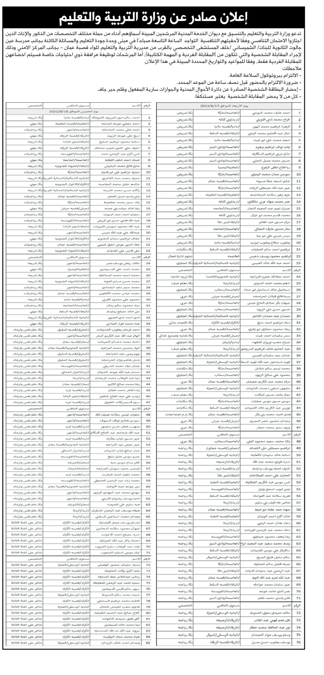 نبأ الأردن– دعت وزارة التربية والتعليم بالتنسيق مع ديوان الخدمة المدنية، مرشحين ممن اجتازوا الامتحان التنافسي، لإجراء المقابلة الشخصية.