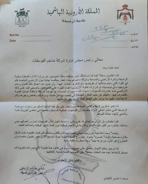 كما تعلمون سابقا فإنه قد تم تشكيل لجان متعاقبة ممثلة بمندوبين عن وزارة الإدارة المحلية وبلدية الرصيفة ودائرة الأراضي والمساحة وشركة مناجم الفوسفات لعمل مخالصة نهائية حول الأراضي الخاصة بكم في اللواء التي سيتم مبادلتها او تفويضها مع الأطراف المشار إليها ؛ وأن طول أمد أعمال تلك اللجان وعدم خروجها بأي توصيات او قرارات لغاية الآن يرتب اعباء كبيرة على المواطنين واضعي اليد على تلك الأراضي منذ عشرات السنوات ؛ سواء كانت بايصال الخدمات او غيرها، اضافة لاعاقة أعمال البلدية بالتصرف فيها ؛ ناهيكم عن عديد المكاره الصحية التي تتسبب بها من نفايات ومركبات وانقاض وغيرها وكمّ الاعتداءات عليها مما يرتب على البلدية أعباء اضافية غير ملزمة بها