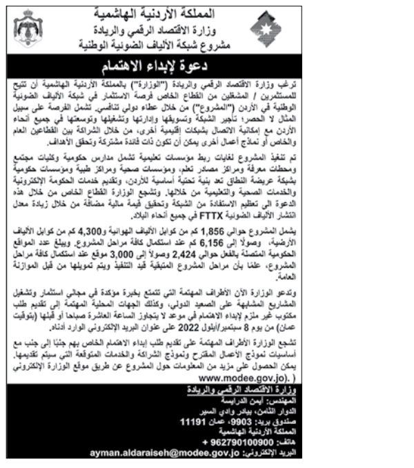 نبأ الأردن– أعلنت وزارة الاقتصاد الرقمي والريادة، رغبتها في إتاحة فرصة الاستثمار في شبكة الألياف الضوئية الوطنية، للمستثمرين أو المشغلين من القطاع الخاص، من خلال عطاء دولي تنافسي.