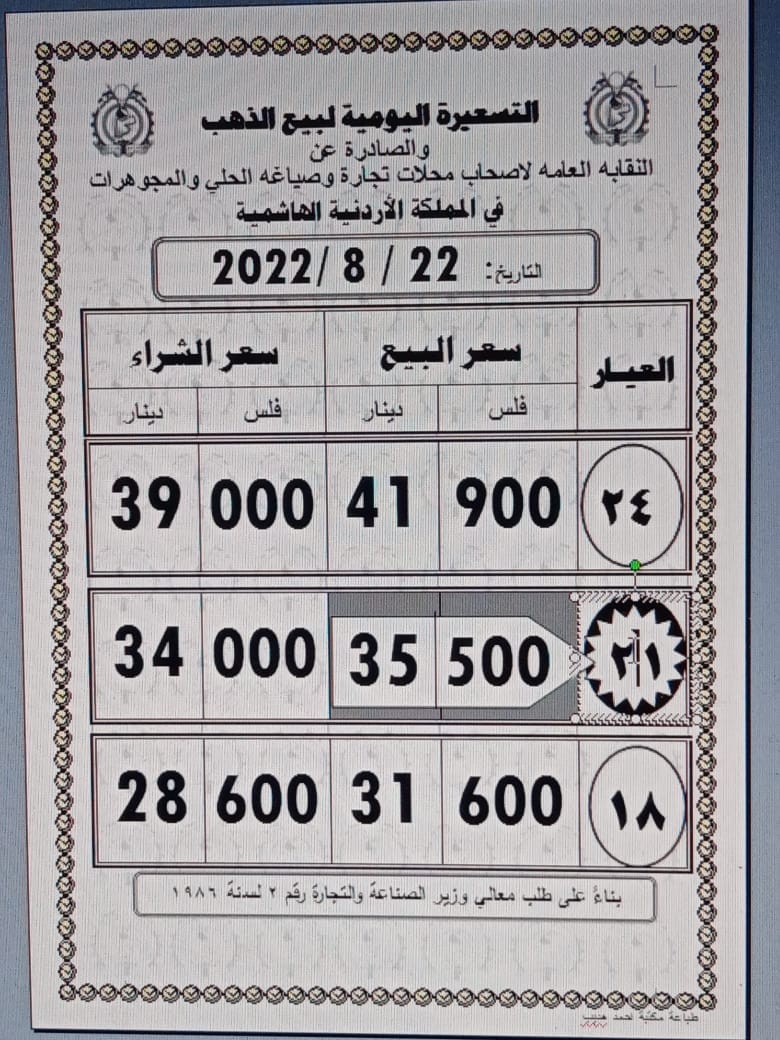 وبلغ سعر بيع غرام الذهب عيار 21 الأكثر رغبة من الأردنيين بالسوق المحلية عند 35,50 دينارا لغايات شراء المواطنين من محلات الصاغة.