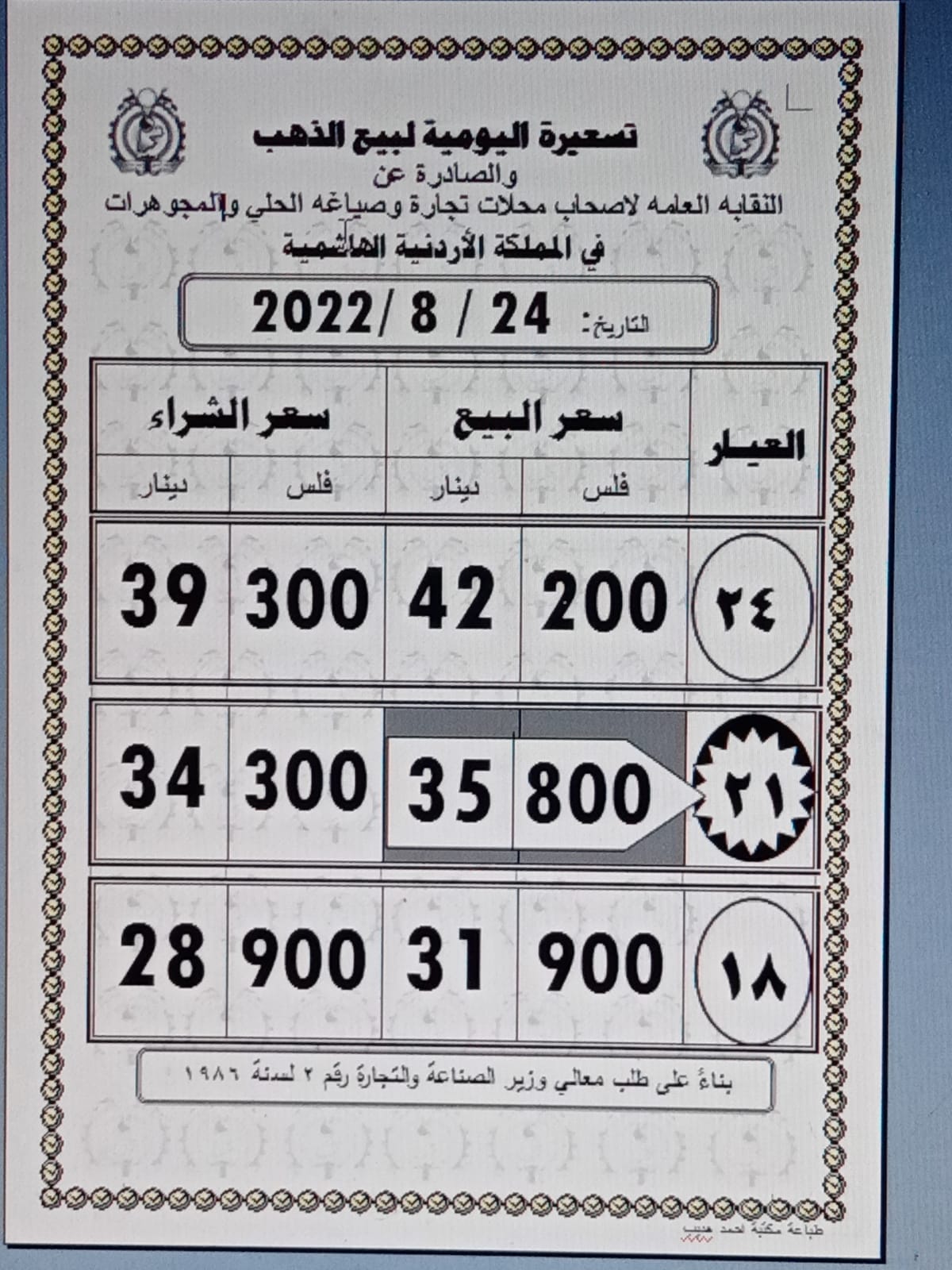 ووفق نقابة أصحاب محلات تجارة وصياغة الحلي والمجوهرات، فقد بلغ سعر بيع غرام الذهب عيار 21 الأكثر رغبة من الأردنيين بالسوق المحلية عند 35,80 دينارا لغايات شراء المواطنين من محلات الصاغة.