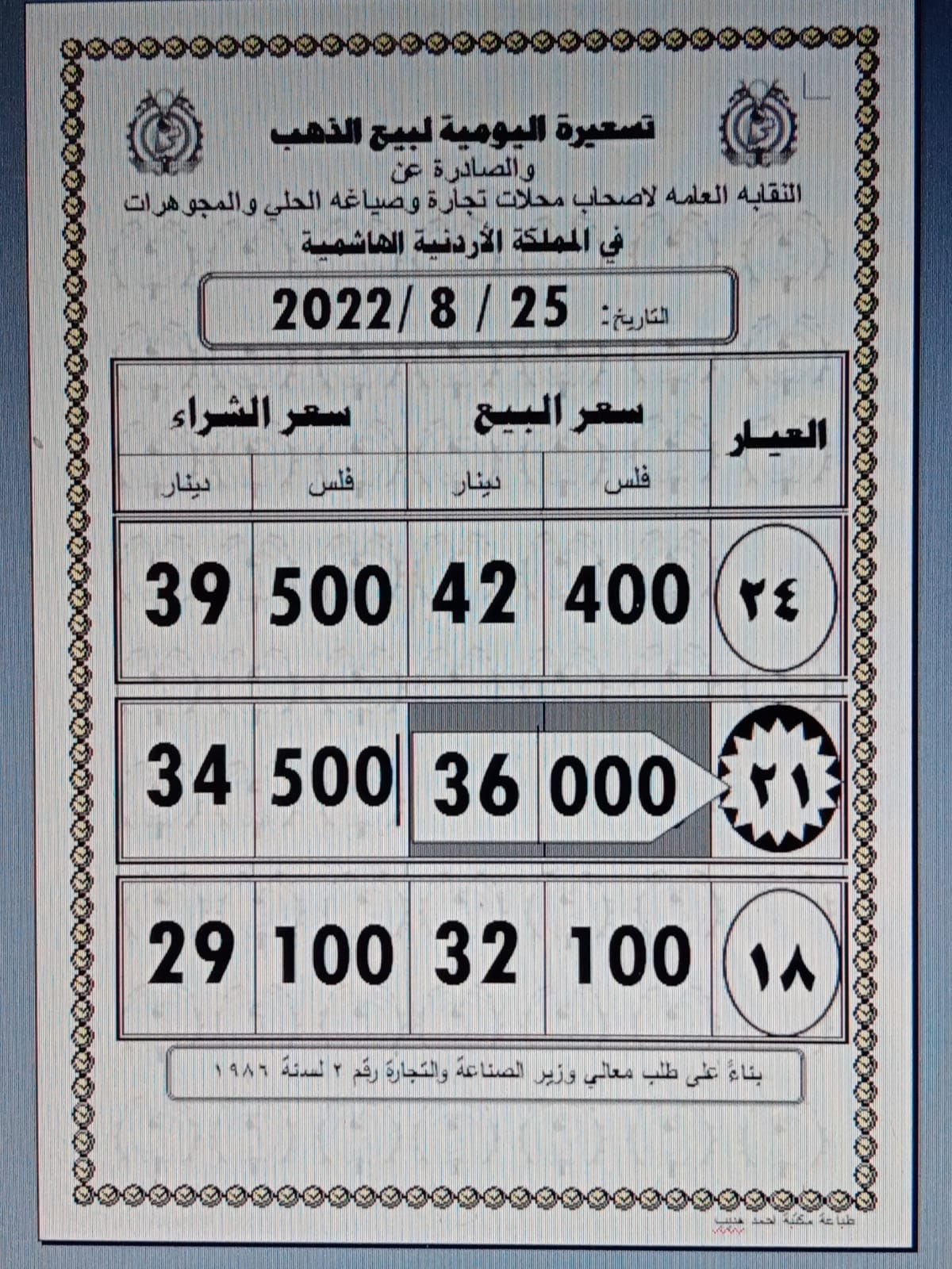 ووفق نقابة أصحاب محلات تجارة وصياغة الحلي والمجوهرات، فقد بلغ سعر بيع غرام الذهب عيار 21 الأكثر رغبة من الأردنيين بالسوق المحلية عند 36،00 دينارا لغايات شراء المواطنين من محلات الصاغة.