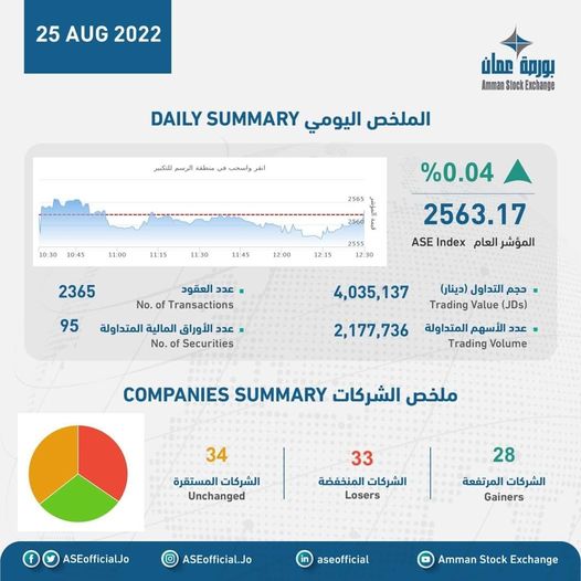 نبأ الأردن - بلغ حجم التداول الإجمالي ليوم الخميس 25/08/2022 حوالي (4.0) مليون دينار وعدد الأسهم المتداولة (2.2) مليون سهم، نفذت من خلال (2,364) عقداً.