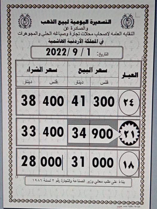 وبلغ سعر بيع غرام الذهب عيار 21 الأكثر رغبة من الأردنيين بالسوق المحلية عند 34,90 دينارا لغايات شراء المواطنين من محلات الصاغة.
