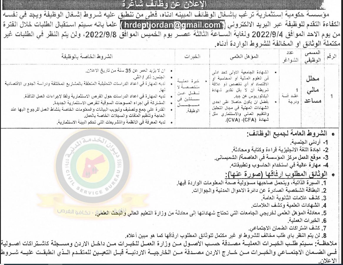 نبأ الأردن - نشر ديوان الخدمة المدنية، اليوم الأحد، عبر موقعه الرسمي، إعلاناً حول توفر وظائف شاغرة في شركة حكومية استثمارية.