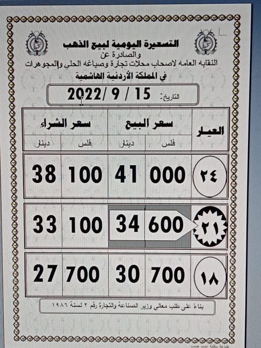 وبلغ سعر بيع غرام الذهب عيار 21 الأكثر رغبة من الأردنيين بالسوق المحلية عند 34,60 دينارا لغايات شراء المواطنين من محلات الصاغة.