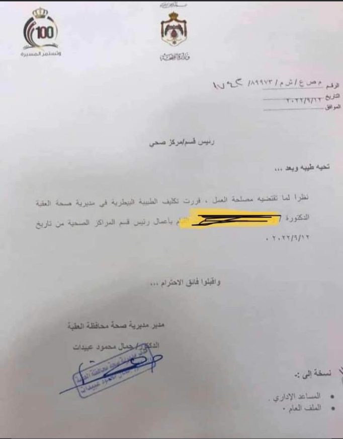 حقيقة تعيين طبيبة بيطرية قائما بأعمال رئيسة قسم المراكز الصحية في العقبة