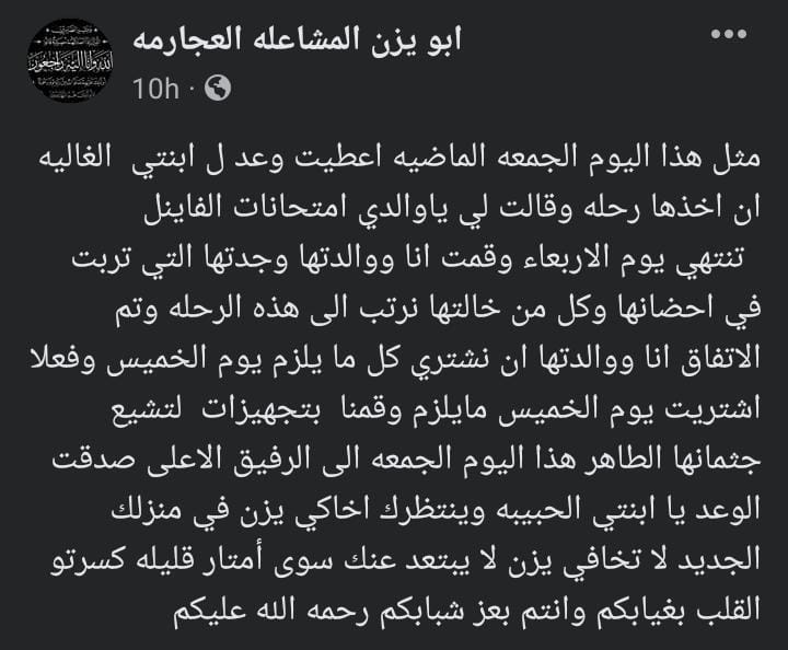 نبأ الأردن- كتب أبو يزن العجارمة، والد الفتاة الأردنية راما العجارمة، والتي توفيت إثر انهيار عمارة في منطقة اللويبدة بالعاصمة عمان، رسالة مؤثرة.