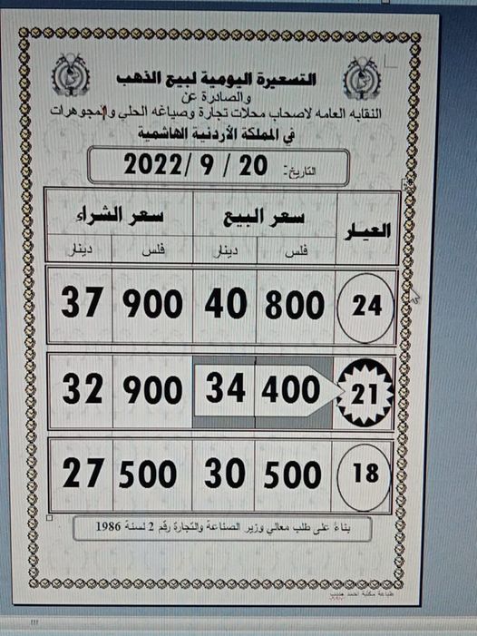 وبلغ سعر بيع غرام الذهب عيار 21 الأكثر رغبة من الأردنيين بالسوق المحلية عند 34,40 دينارا لغايات شراء المواطنين من محلات الصاغة.