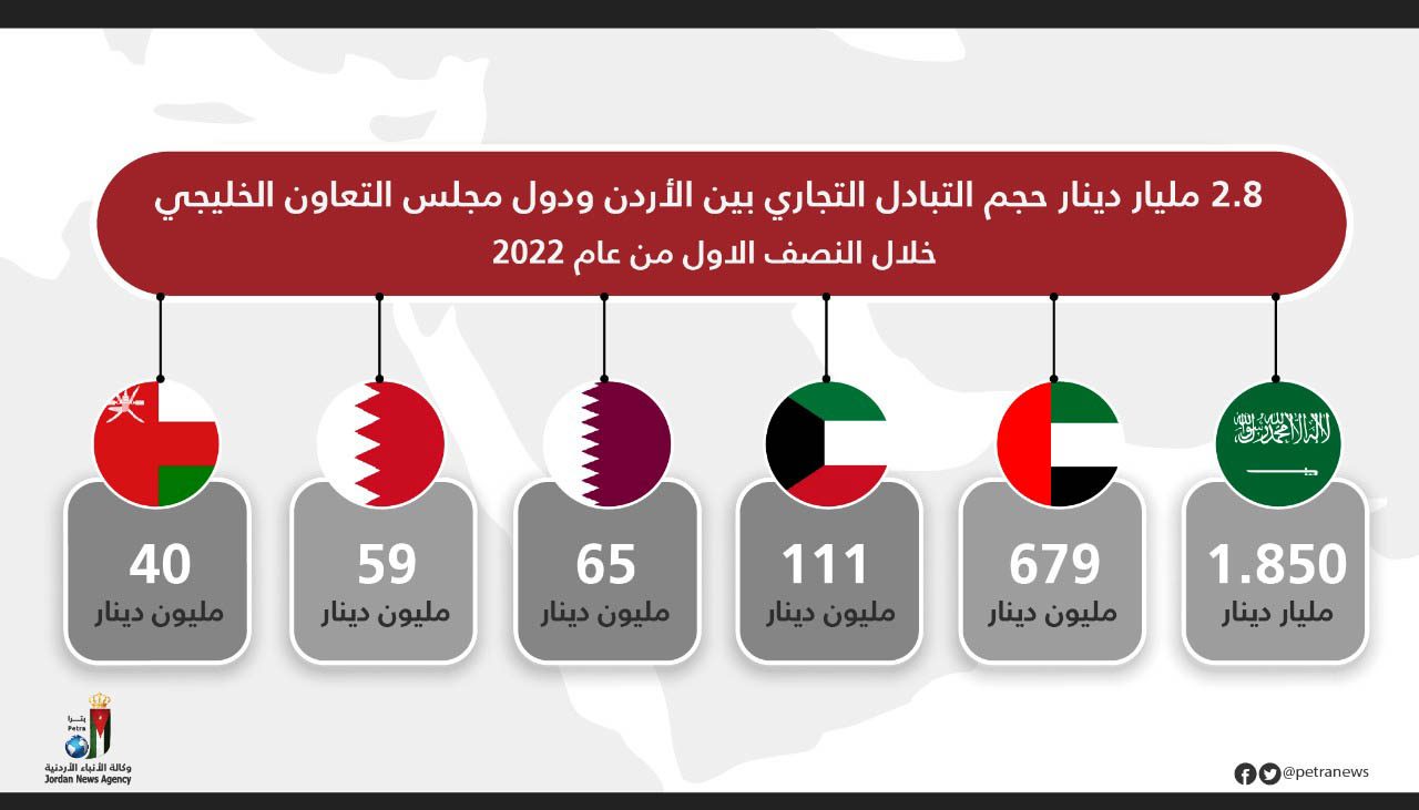 نبأ الأردن- ارتفع إجمالي حجم التبادل التجاري بين الأردن ودول مجلس التعاون الخليجي بالنصف الأول من العام الحالي ليصل إلى 2.804 مليار دينار، مقارنة مع 2.044 مليار دينار للفترة نفسها من العام الماضي 2021.