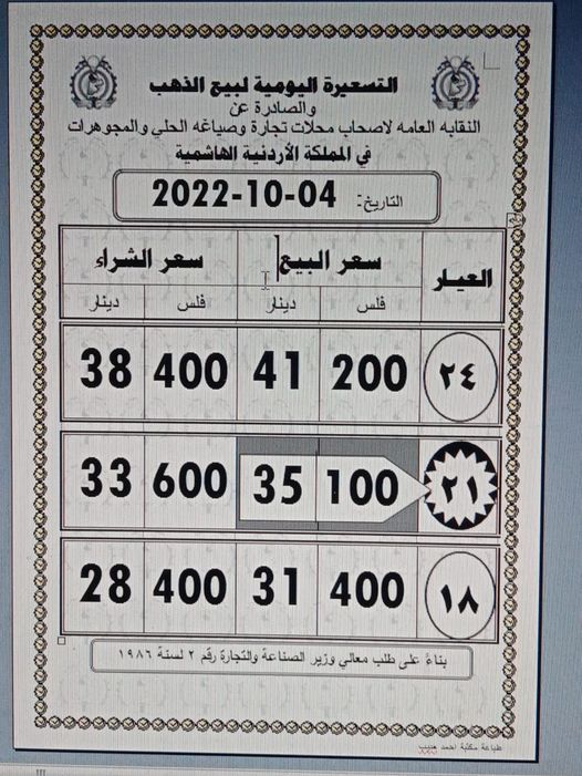 وبلغ سعر بيع غرام الذهب عيار 21 الأكثر رغبة من الأردنيين بالسوق المحلية عند 35,10 دينارا لغايات شراء المواطنين من محلات الصاغة.