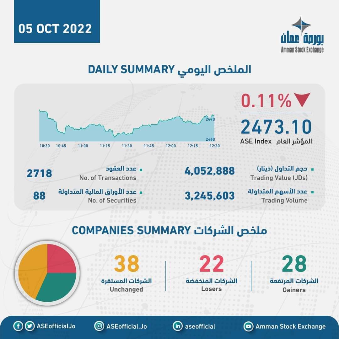 نبأ الأردن- بلغ حجم التداول الإجمالي ليوم الأربعاء 05/10/2022 حوالي (4.1) مليون دينار وعدد الأسهم المتداولة (3.2) مليون سهم، نفذت من خلال (2,717) عقداً.