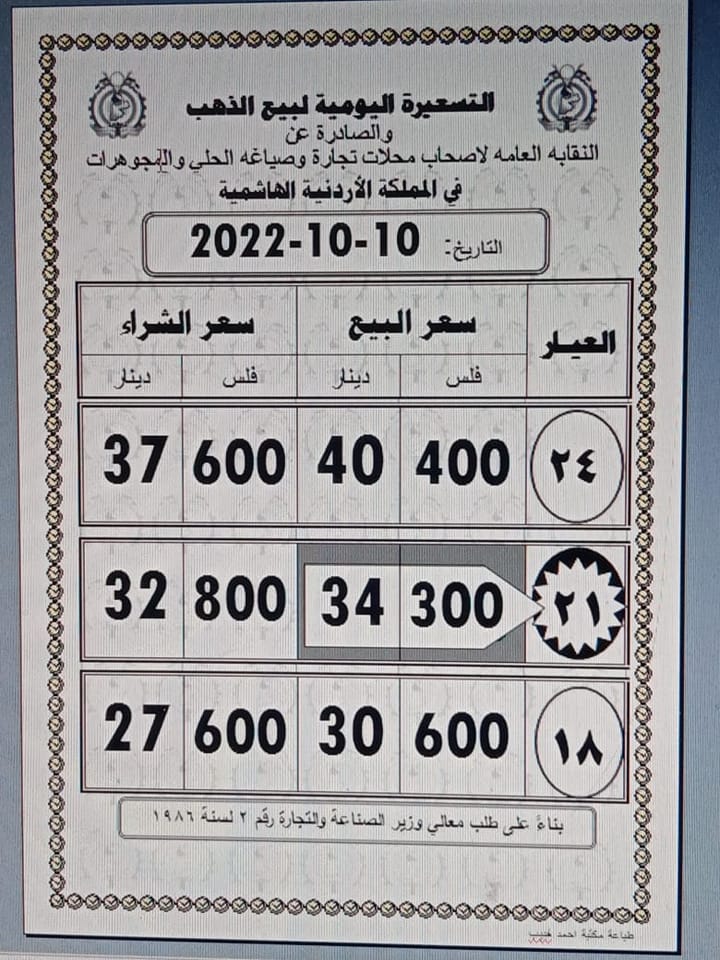 وبلغ سعر بيع الغرام الواحد من الذهب عياري 24 و18 لغايات الشراء من محلات الصاغة، عند 40.40 و30.60 دينار على التوالي.