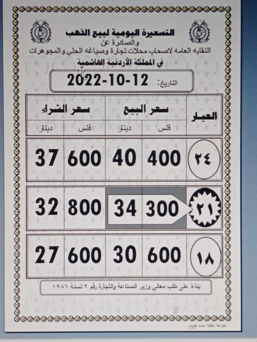 وبلغ سعر بيع غرام الذهب عيار 21 الأكثر رغبة من الأردنيين بالسوق المحلية عند 34,30 دينارا لغايات شراء المواطنين من محلات الصاغة.