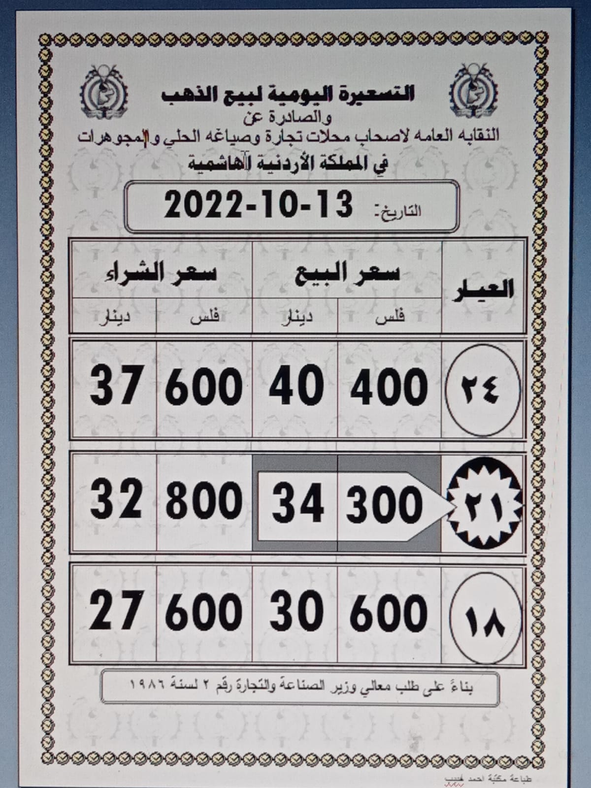 وبلغ سعر بيع غرام الذهب عيار 21 الأكثر رغبة من الأردنيين بالسوق المحلية عند 34,30 دينارا لغايات شراء المواطنين من محلات الصاغة.