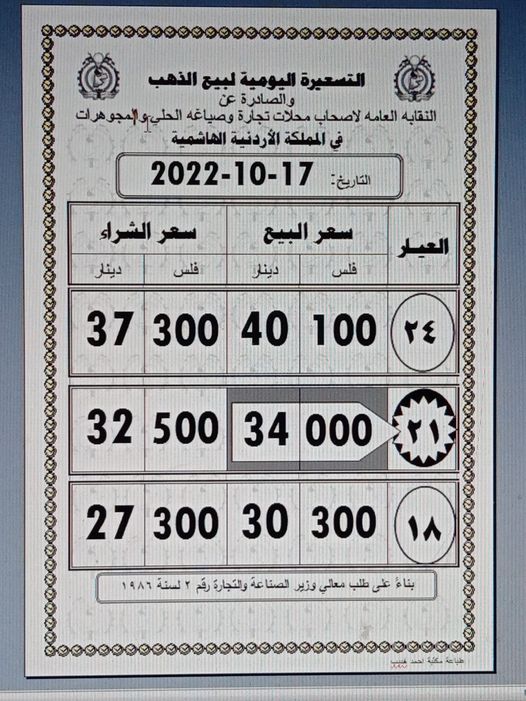 وبلغ سعر بيع غرام الذهب عيار 21 الأكثر رغبة من الأردنيين بالسوق المحلية عند 34,00 دينارا لغايات شراء المواطنين من محلات الصاغة.