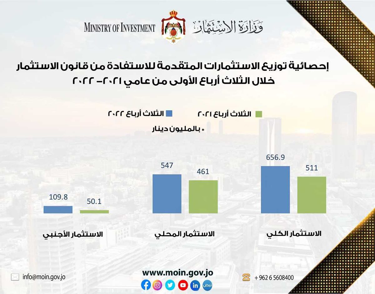 نبأ الأردن- ارتفع حجم الاستثمارات المستفيدة من قانون الاستثمار، منذ بداية العام وحتى نهاية أيلول الماضي بنسبة 29 بالمئة، لتبلغ قيمتها 657 مليون دينار، مقارنة بالفترة نفسها من عام 2021، حيث بلغ 511 مليون دينار.