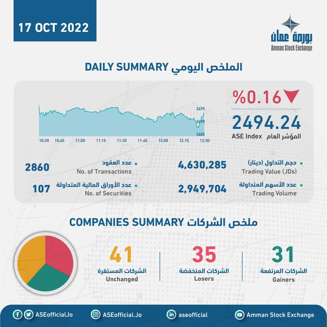 نبأ الأردن- بلغ حجم التداول الإجمالي ليوم الاثنين 17/10/2022 حوالي (4.6) مليون دينار وعدد الأسهم المتداولة (2.9) مليون سهم، نفذت من خلال (2,858) عقداً.