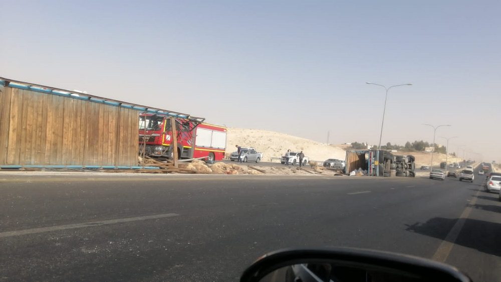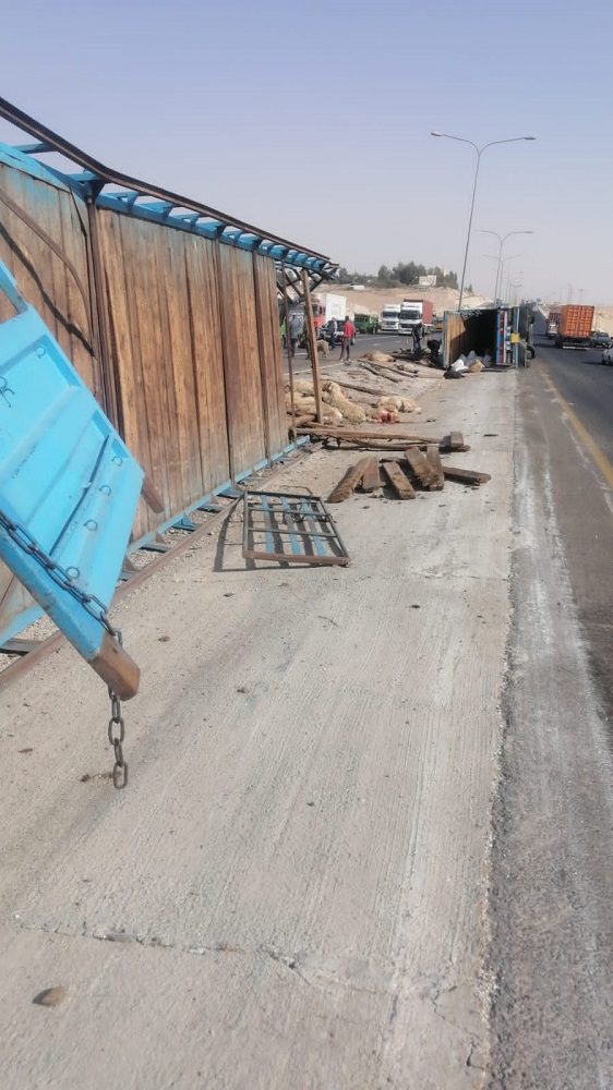 نبأ الأردن- أظهرت صور متداولة، تدهور شاحنة نقل محملة بالأغنام على الطريق الصحراوي جنوب الأردن.