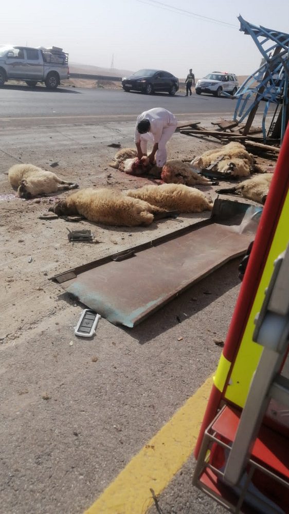 وأظهرت الصور نفوق عدد كبير من الأغنام إثر انقلاب الشاحنة.