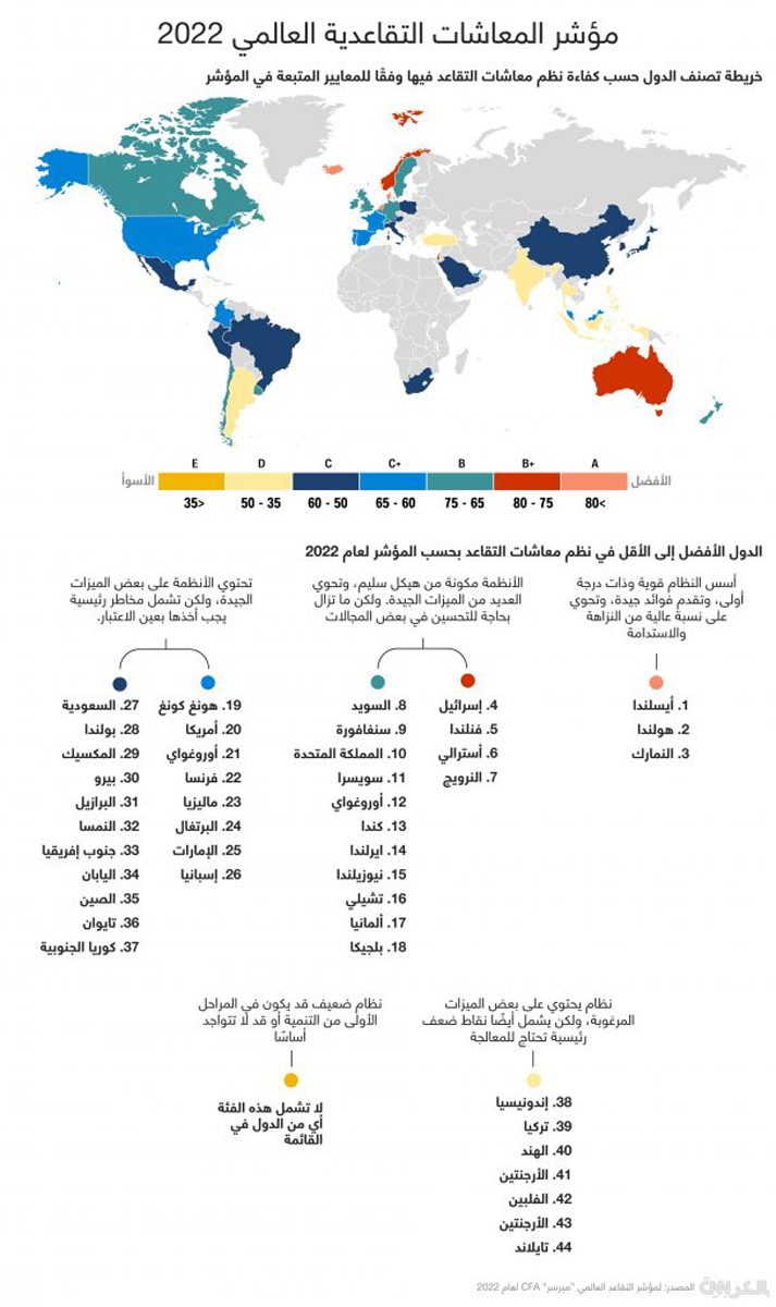 نبأ الأردن- وفقًا لمؤشر المعاشات التقاعدية العالمي “ميرسر CFA” لعام 2022، والذي يقارن 43 منظومة للمعاشات المُستحقّة للمتقاعدين، أظهرت الدراسة بأن آيسلندا وهولندا والدنمارك لديها أفضل الأنظمة للتقاعد، لتحصل كل منها على درجة “A” في عام 2022 .