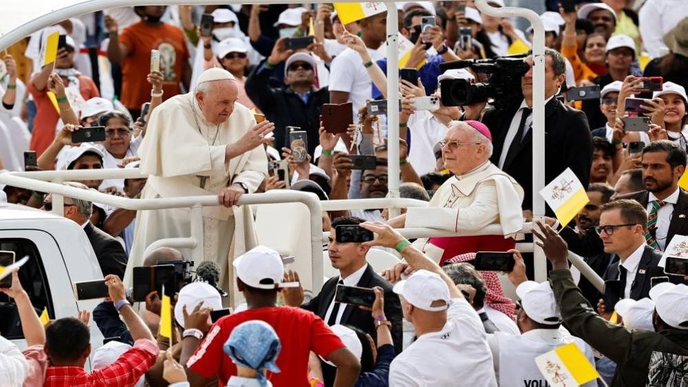 والقداس السبت هو ثاني محطة يلتقي فيها البابا فرنسيس المسيحيين الكاثوليك، بعد محطة أولى مساء الجمعة في كاتدرائية سيدة العرب، الكنيسة الكاثوليكية الأكبر في الخليج، التي دخلها على وقع التصفيق والدموع.