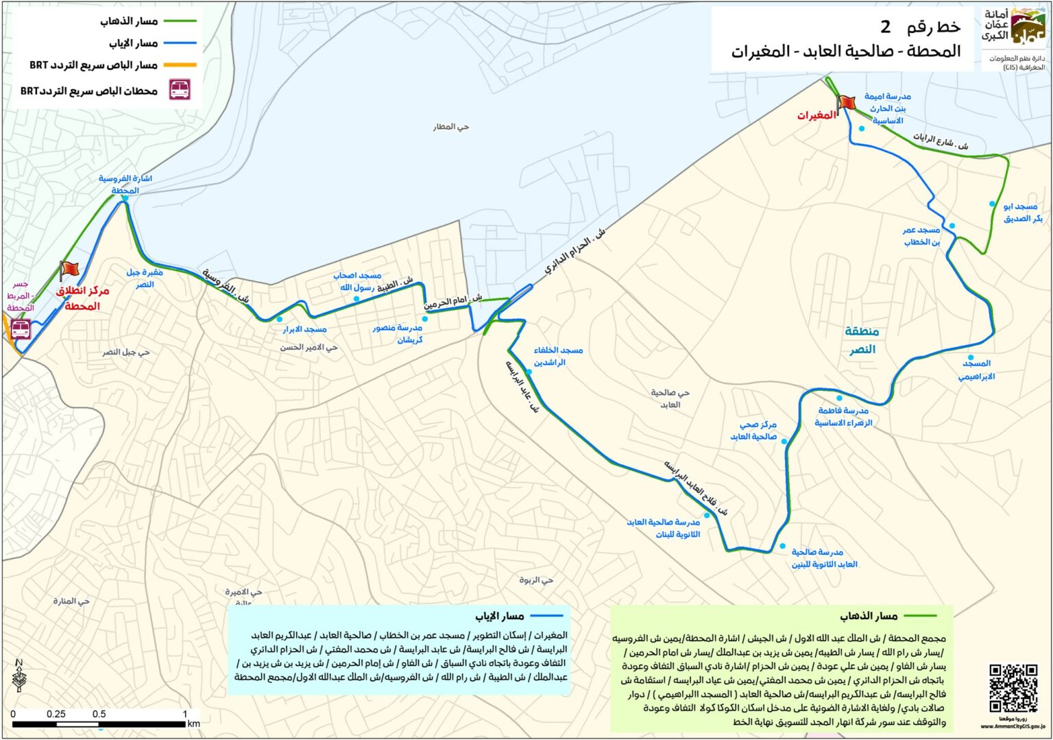 كما ينطلق الخط رقم 2 (مجمع المحطة – صالحية العابد-المغيرات) في رحلة الذهاب من مجمع المحطة، ويسير في: شارع الملك عبدالله الأول، شارع الجيش، إشارة المحطة، يمين شارع الفروسية، يسار شارع رام الله، يسار شارع الطيبة، يمين شارع يزيد بن عبدالملك، يسار شارع إمام الحرمين، يسار شارع الفاو، يمين شارع علي عودة، يمين شارع الحزام، إشارة نادي السباق الالتفاف والعودة باتجاه شارع الحزام الدائري، يمين شارع محمد المفتي، يمين شارع عباد البرايسه، شارع فالح البرايسه، شارع عبدالكريم البرايسه، شارع صالحية العابد (المسجد الإبراهيمي)، ميدان صالات بادي، الإشارة الضوئية مدخل إسكان الكوكا كولا، الالتفاف والعودة والتوقف بالقرب من شركة أنهار المجد للتسويق.