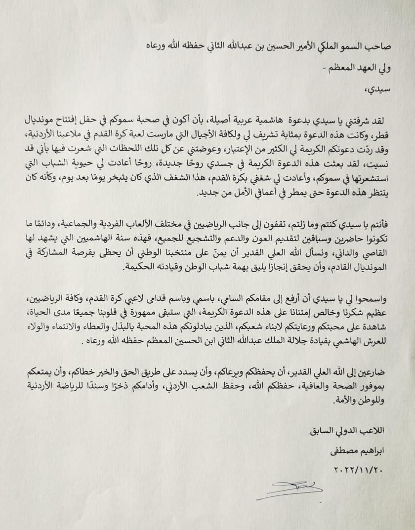 وقال مصطفى والملقب بـ”الرهوان” في رسالته، مساء الأحد، لقد شرفتني يا سيدي بدعوة هاشمية عربية أصيلة بأن أكون في صحبة سموكم في حفل افتتاح مونديال قطر، وكانت هذه الدعوة بمثابة تشريف لي ولكافة الأجيال التي مارست لعبة كرة القدم في ملاعبنا الأردنية.