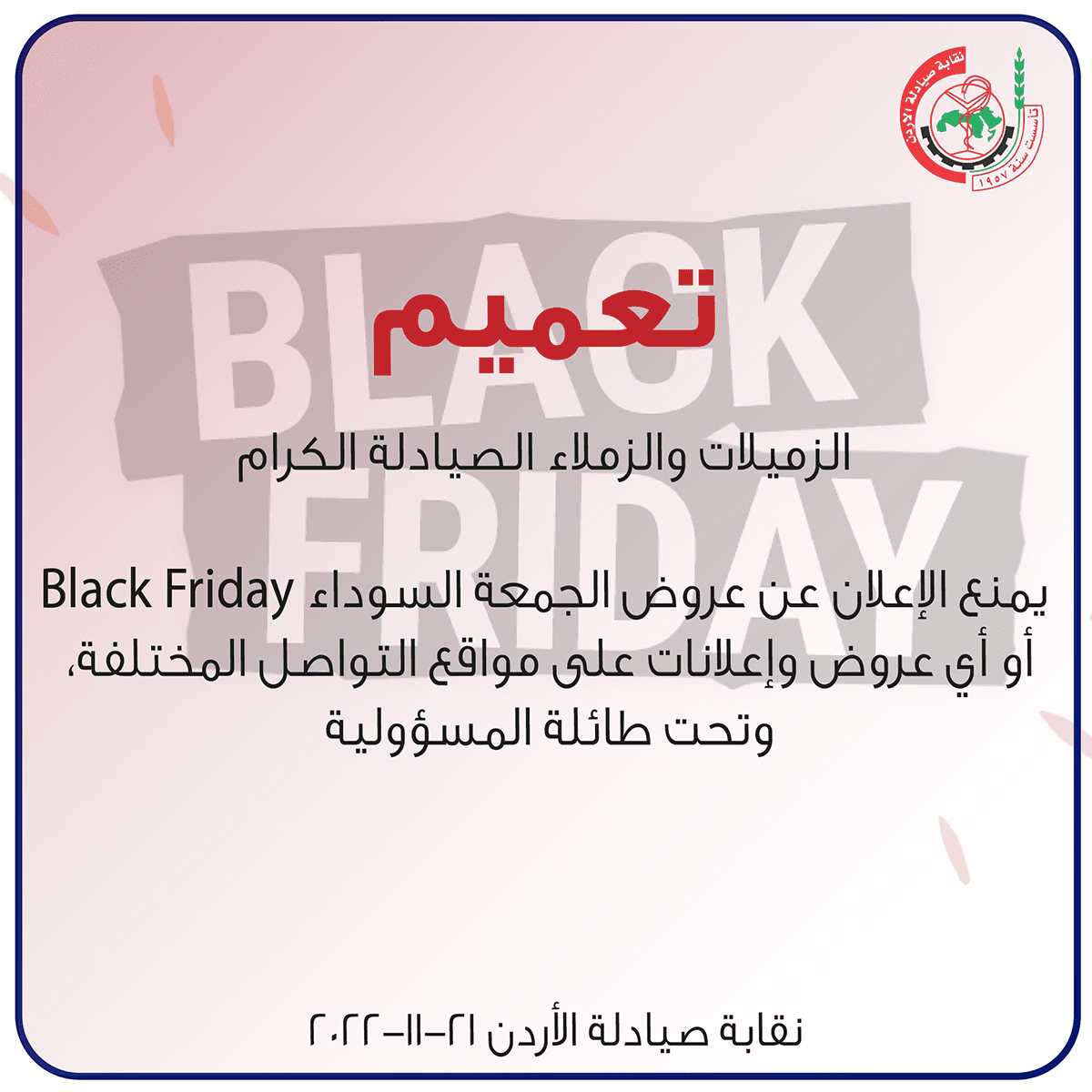نبأ الأردن-عممت نقابة الصيادلة الأردنية على الصيادلة ، بمنع الإعلان عن عروض الجمعة السوداء Black Friday أو أي عروض وإعلانات على مواقع التواصل المختلفة.