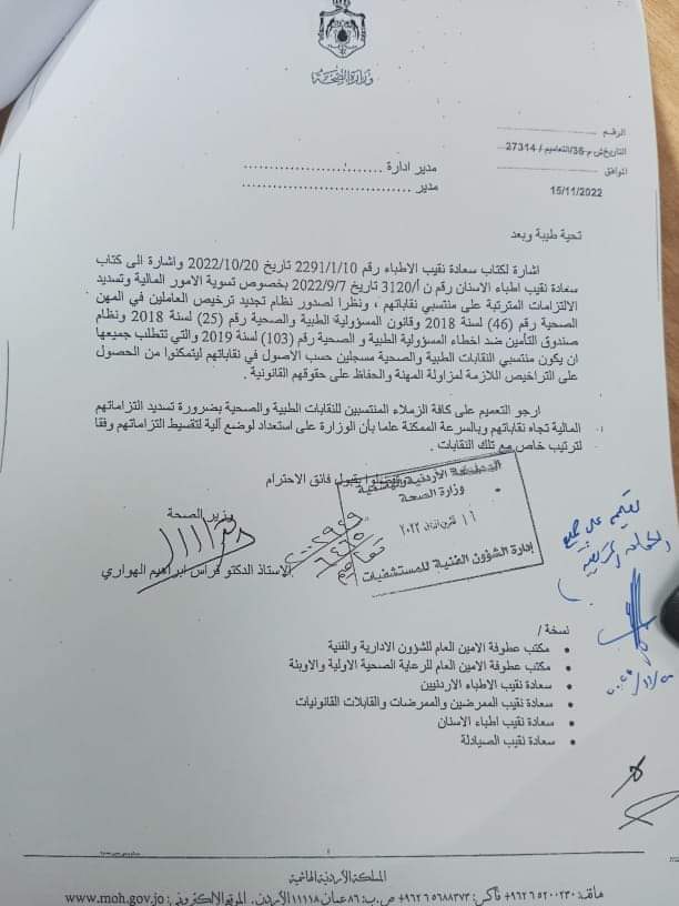 نبأ الأردن-بعد صدور كتاب وزير الصحة د.فراس الهواري و ضرورة التسديد للنقابات و تسوية أوضاع المنتسبين نقابيا وجه عدد من أطباء وزارة الصحة رسالة لوزير الصحة و نقيب الأطباء جاء فيها :