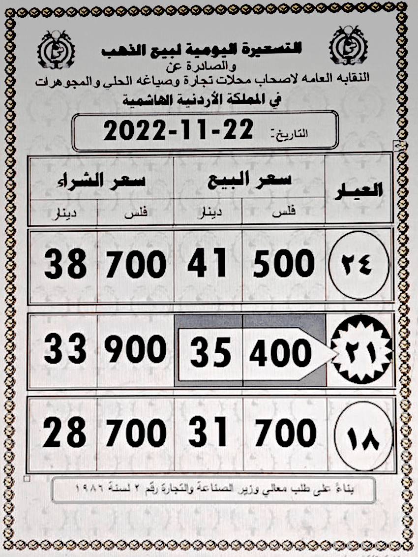وبلغ سعر بيع غرام الذهب عيار 21 الأكثر طلبا 35.40 دينار لغايات شراء المواطنين، مقابل 33.90 دينار لجهة البيع لمحال الصاغة.