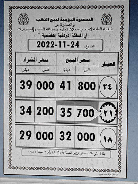 نبأ الأردن-سجلت أسعار الذهب في الأسواق الأردنية الخميس، ارتفاعا بمقدار 30 قرشا للغرام من عيار 21، وفق النشرة اليومية الصادرة عن نقابة أصحاب محلات تجارة وصياغة الحلي والمجوهرات.
