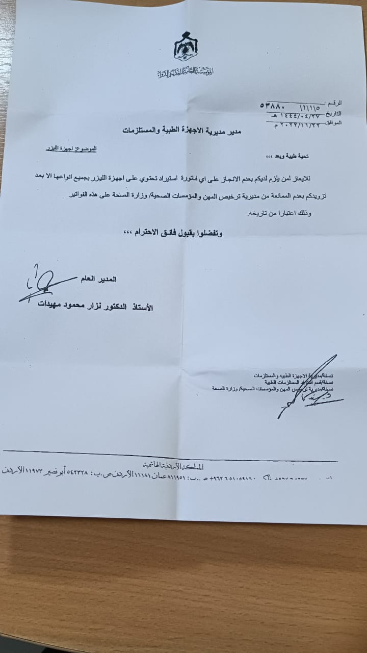 نبأ الأردن-أصدرت المؤسسة العامة للغذاء و الدواء كتابا لمديرية الأجهزة الطبية و المستلزمات التابعة لها مفاده عدم إنجاز على أي فاتورة إستيراد تحتوي على أجهزة الليزر بجميع أنواعها إلا بعد تزويدها بعدم الممانعة من مديرية ترخيص المهن و المؤسسات الصحية في وزارة الصحة .
