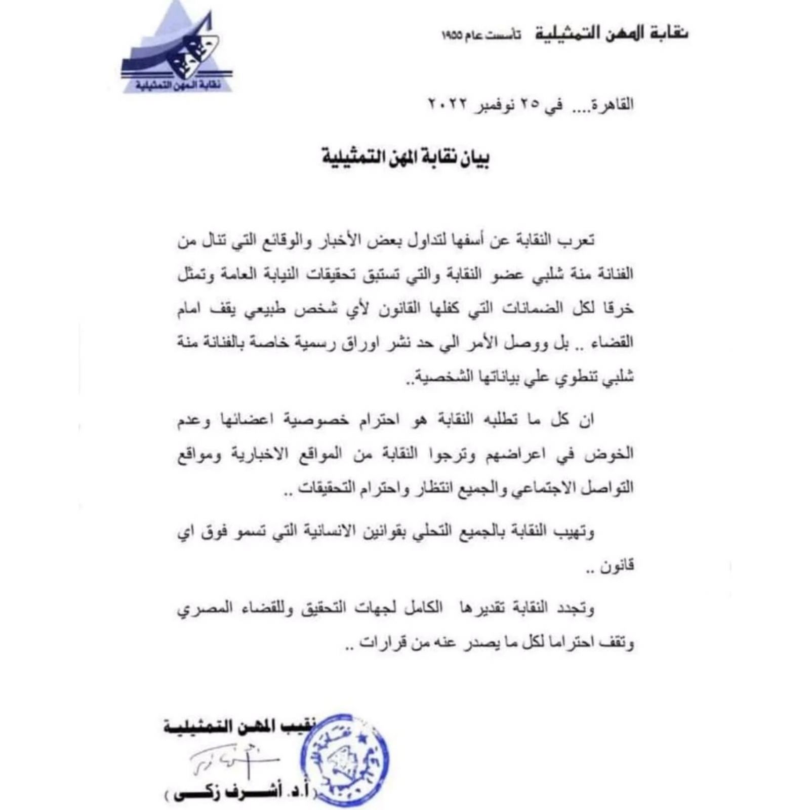 أصدرت نقابة المهن التمثيلية المصرية برئاسة الدكتور أشرف زكى بيانا بشأن واقعة القبض على الفنانة منة شلبي والتحفظ عليها بمطار القاهرة.