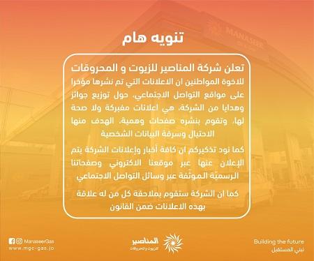 نبأ الأردن-أعلنت شركة المناصير للزيوت والمحروقات للاخوة المواطنين أن الاعلانات المتدوالة مؤخرا على مواقع التواصل الاجتماعي حول توزيع جوائز وهدايا من الشركة هي إعلانات مفبركة ولاصحة لها ، حيث يتم نشره تلك الاعلانات من قبل صفحات وهمية بهدف الاحتيال وسرقة البيانات الشخصية.