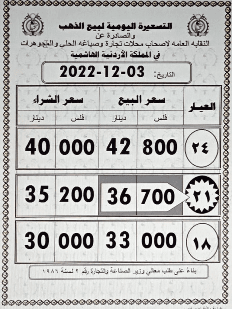 ووفقا للتسعيرة الجديدة ، ارتفع سعر بيع الغرام الواحد من عيار 21 قيراط، الأكثر طلبا بين الأردنيين، إلى 36.7 دينار لغايات البيع من قبل التجار للمواطنين، و35.2 دينار للشراء من قبل التجار.