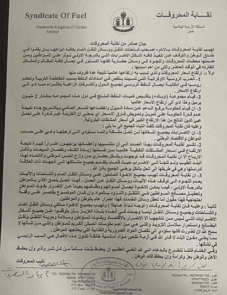 ووجهت النقابة "نداء عاجلا" الى مـالكي وسائل النقـل الـعـام والشاحنات وجميـع وسـائل النقـل أينمـا وجـدوا فـي جميع أنـحـاء الوطن بـأن يتوقفـوا عـن جميـع أشـكـال الاضرابات التـي لـيس مـن نتائجهـا الا الاضرار بالاقتصـاد وبقـوت المـواطن وسلامة وحرية التنقـل ونـقـل البضائع واستمرار سلاسل التزويـد والـتـي هـي مـن أهـم مقومـات الـعـيش الكريم للمواطن والتـي مـن شـأنها لا سمح الله ان تضررت فانها ستؤدي إلى نقصان المواد الضرورية والغذائية التي يحتاجها المواطن، مـمـا يـعنـي دخول البلد لا قدر الله في أزمـة نقـص مـواد أساسية خانقة تكـون هذه الافعـال هي السبب الرئيسي.