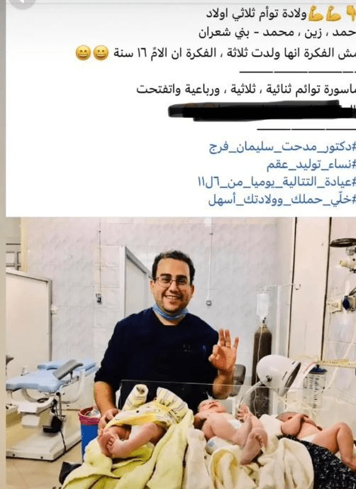نشر دكتور مدحت على صفحته الشخصية بوست يقول فيه: "ولادة توأم ثلاثي أولاد، أحمد، زين، ومحمد، مش الفكرة إنها ولدت ثلاثة، الفكرة إن الأم 16 سنة"، ليتابع ساخرًا "ماسورة توائم ثلاثية".