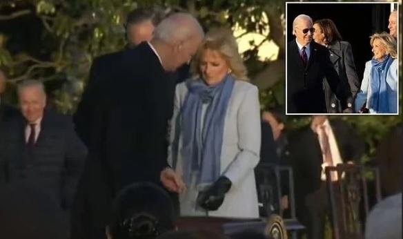 على إثر ذلك، جلس الرئيس الأمريكي محاطا بالسيدة الأولى جيل ونائبة الرئيس كامالا هاريس والرجل الثاني دوغ إمهوف، مع بدء الاحتفال.
