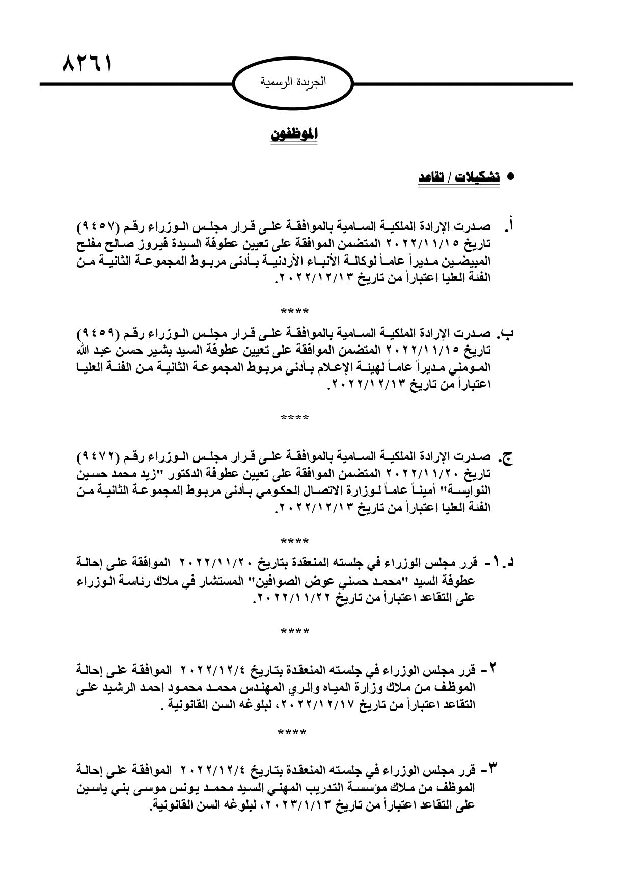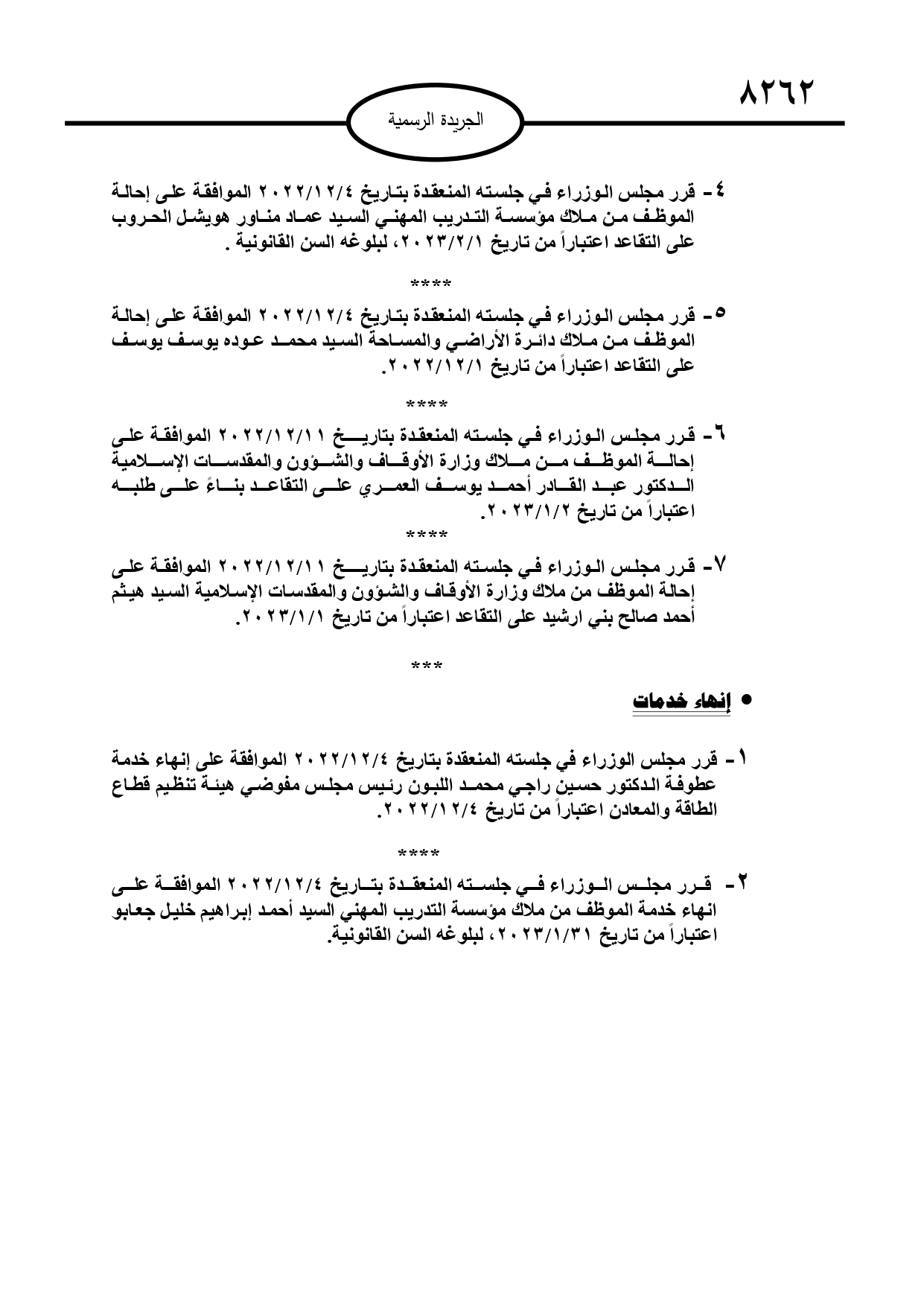 وبحسب الجريدة الرسمية الصادرة عن الحكومة، الخميس، قرر مجلس الوزراء إحالة عدد من الموظفين إلى التقاعد، وإنهاء خدمات آخرين.